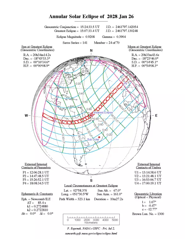 Según las estimaciones de la NASA, el eclipse solar visible en México será hasta el 26 de enero de 2028, y será de tipo anular. El evento podrá apreciarse en gran parte del continente americano, una parte de Europa y el noreste de África.