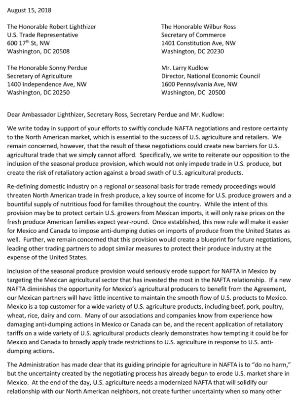 En la tercera ronda de renegociación del TLCAN Estados Unidos hizo la propuesta de poner aranceles a las importaciones de frutas y hortalizas mexicanas, cuando estas se cosecharan en el mercado estadounidense.