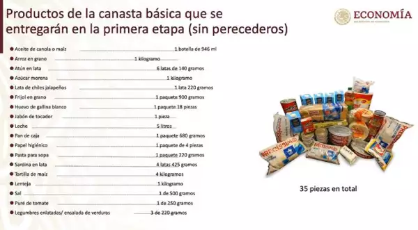 Por instrucciones del presidente de la República, Andrés Manuel López Obrador, se entregarán canastas básicas que contienen 35 piezas de 24 productos alimenticios esenciales.