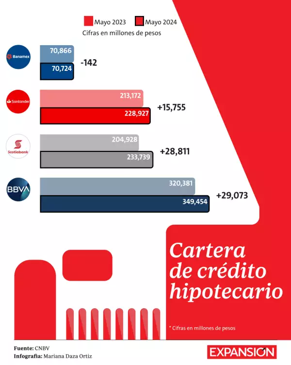 Hasta mayo pasado, BBVA México se mantenía como el líder en este segmento, con 349,454 millones de pesos en cartera de crédito de vivienda, seguido de Banorte, con 261,831 millones.