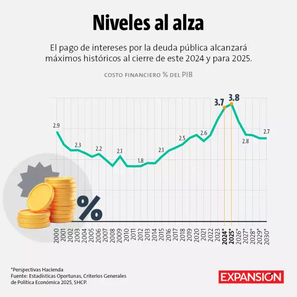 El costo financiero de la deuda llegará a niveles máximos históricos a finales de 2024 y 2025, refieren cifras de la Secretaría de Hacienda y Crédito Público (SHCP). De acuerdo con los Criterios Generales de Política Económica (CGPE), el pago de intereses por la deuda en México llegará a 3.7% del PIB este año y a 3.8% del PIB el siguiente, las proporciones más altas de las que se tenga registro, al menos desde el año 2000.