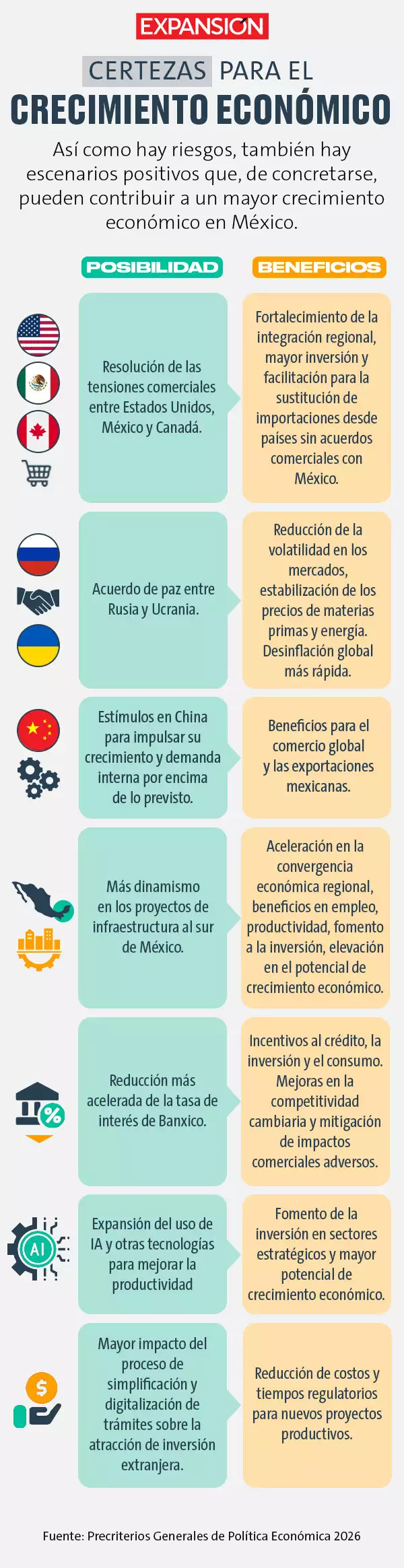 Así como hay riesgos para que la economía crezca menos a lo esperado por Hacienda, también hay situaciones que de concretarse pueden abonar a un mayor crecimiento económico, de acuerdo con los Precriterios.