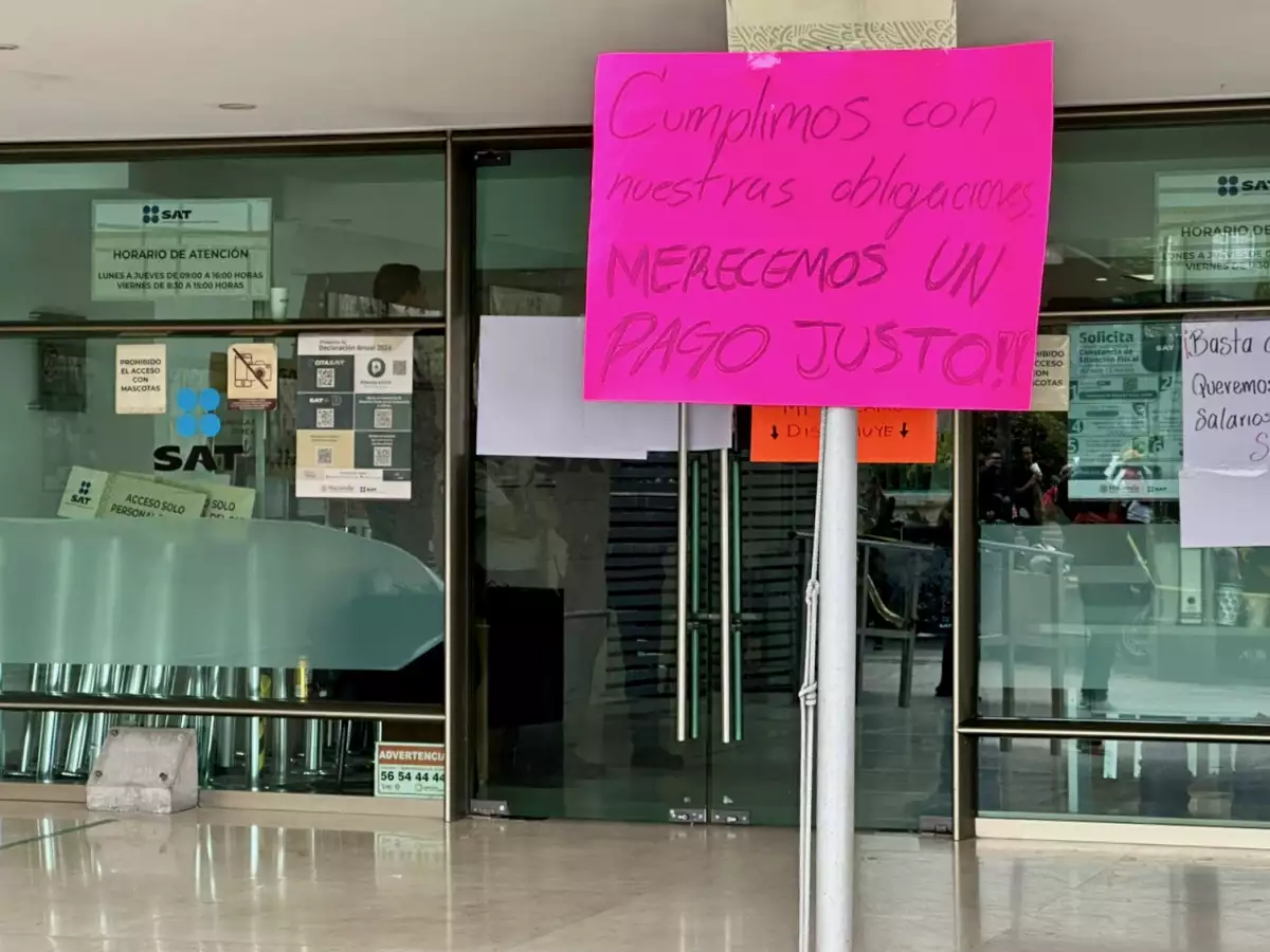 Las cartulinas con consignas cubren las ventanas del módulo de Anzures y otras se despliegan de las manos de quienes participan en el paro: “La recaudación es histórica y nuestros sueldos miserables”, “Recaudo millones y no recibo aumento, ¡¡¡BASTA!!!”, “No más amenazas. El personal del SAT sostiene al país con su trabajo, ¡merecemos un incremento digno!”, “Trabajo digno Salario Justo, PARO NACIONAL SAT, 14 octubre 2025”, “Trabajamos más de 12 horas, sin pago digno, somos la Institución Recaudadora, y la única que no recibe un salario digno”, “No pagan pasajes desde abril”.