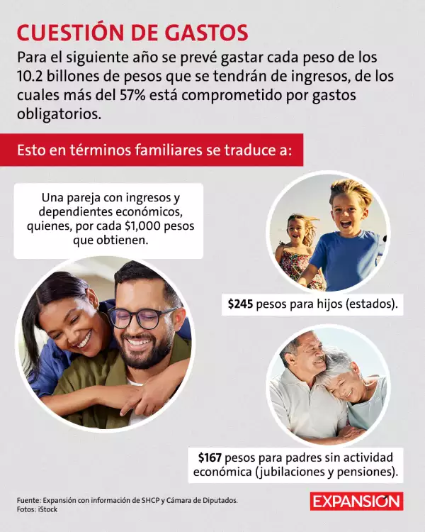 Esto, en términos familiares se traduce a una pareja activa con ingresos, y con dependientes económicos como hijos y padres, para quienes en el primer caso destinaría 245 pesos de cada 1,000 que ingresan o el 24.5%; mientras que para los segundos, el monto llegaría a los 167.18 pesos por cada 1,000.