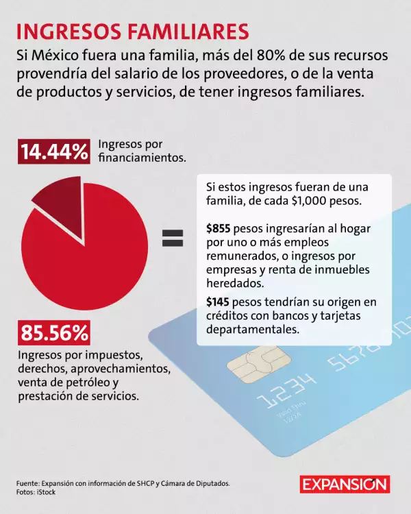Si estos ingresos y gastos fueran de una familia mexicana, 855 pesos de cada 1,000 que ingresan al hogar serían por uno o más empleos remunerados, o al ser dueña de empresas que ofrecen bienes y servicios (Pemex y CFE), además del cobro de rentas por inmuebles heredados (cobro de derechos e impuestos).