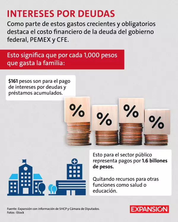 Por deudas y préstamos acumulados, esta pareja debe apartar 161.27 pesos de cada 1,000 que gasta, para el pago de intereses. Esto en términos de las finanzas públicas se traduce en 1.613 billones de pesos, incluyendo los costos financieros del gobierno federal, Pemex y CFE.