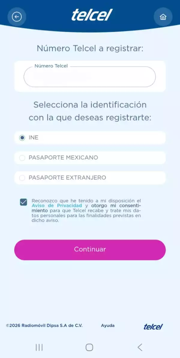 Posteriormente, Telcel dará la opción de elegir qué documento vincular con el número celular: INE, pasaporte mexicano o pasaporte extranjero. Selecciona la casilla que sea tu caso y da clic en el consentimiento del Aviso de Privacidad.