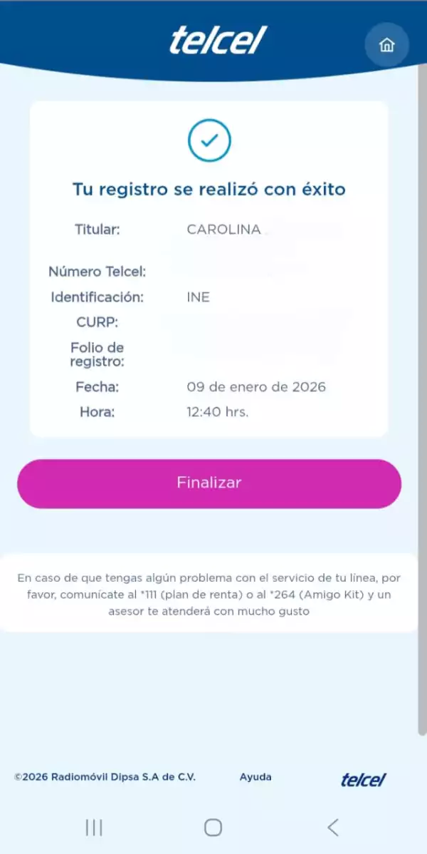 Y listo. Tu registro se habrá realizado con éxito. La pantalla mostrará la información del titular con la línea vinculada, la fecha y hora en que se realizó el trámite. Te llegará un SMS con la confirmación.