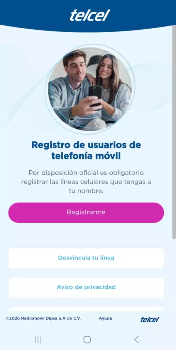 Telcel te dirigirá a un nuevo sitio web para realizar el registro. En ese portal están adjuntos los Términos y Condiciones, el Aviso de Privacidad, así como la opción de desvincular línea. Da clic al botón ‘Registrarme’.