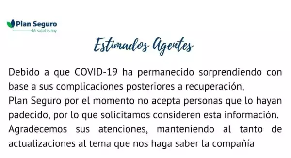 En días recientes, se dio a conocer que la aseguradora Plan Seguro no admitirá a personas que hayan padecido la enfermedad debido a "las complicaciones posteriores" a la recuperación por el virus.