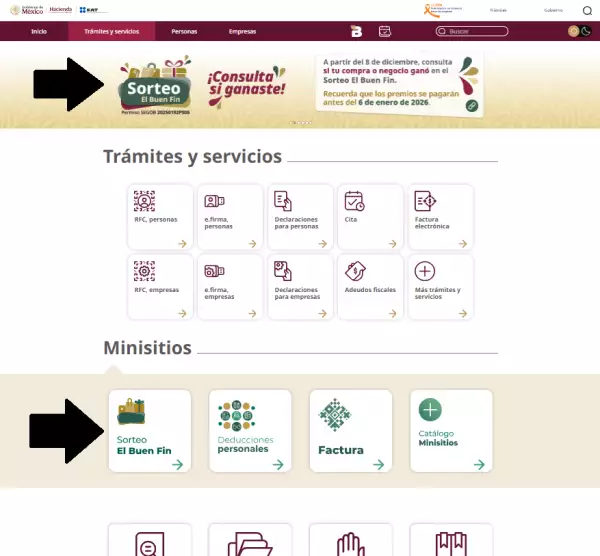 Posteriormente, ya en el menú del SAT, puedes acceder desde el banner del Sorteo en la parte superior de la pantalla, o desde el minisitio en la parte inferior.