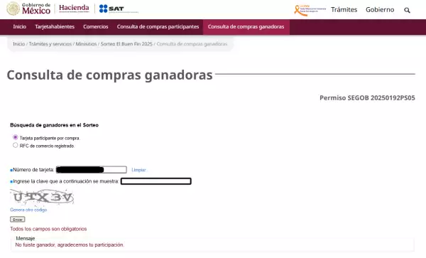Deberás poner el dato según el caso, y la clave en la parte inferior, y después dar clic en “Enviar”. El sitio se actualizará en la parte inferior con el mensaje de si eres ganador o no.