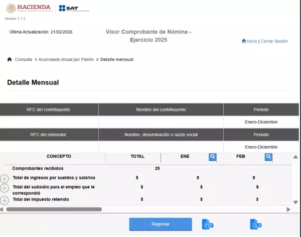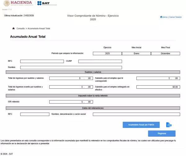 Al dar clic en ‘Consulta’, el sitio desplegará un Acumulado Anual Total de los ingresos y retenciones informadas al SAT entre enero y diciembre de 2025. Mostrará los detalles reportados, como el concepto de ingresos (Sueldos y salarios), si hay montos exentos, su aplicaron subsidios, y el total del ISR retenido en el año.