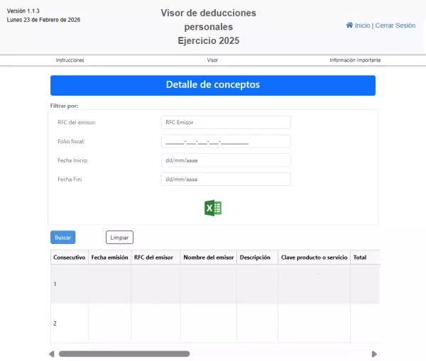 Se puede revisar el detalle de las deducciones, y permite filtrar por RFC del emisor, el folio fiscal, o las fechas. La plataforma enlistará información y las facturas (tanto en PDF como XML) que comprueban las deducciones.