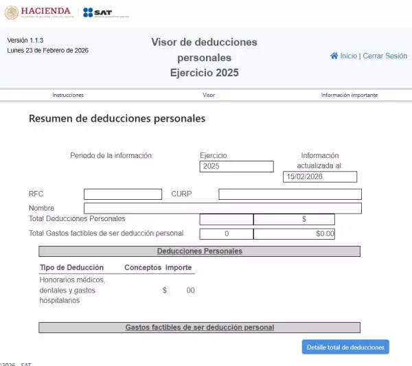 Instrucciones: Es la parte informativa de cómo funciona el visor y la información disponible en ella. Destaca que se podrán hacer las consultas de los conceptos considerados como deducciones personales, los CFDI ya que son considerados así como los gastos factibles de serlo.