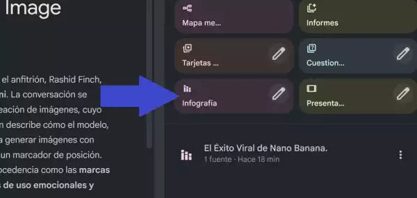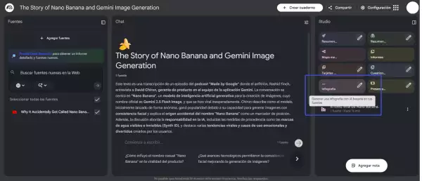En NoteebookLM, está disponible de manera secundaria en la sección de Studio, como ‘Infografía’. Esta opción no es la más adecuada para crear imágenes con prompts, a diferencia de las dos anteriores.